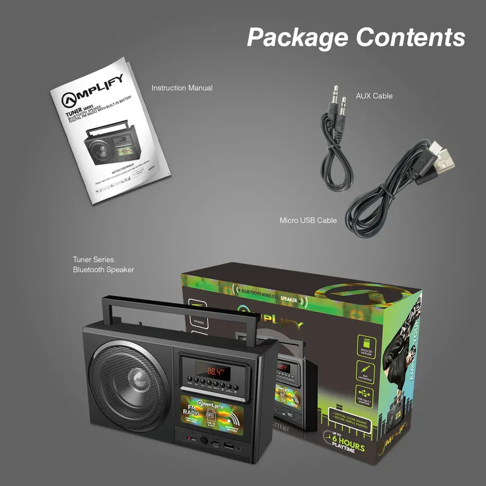 Bluetooth Version: 5.0 Range: Up to 10 m Output Power: 5 W RMS Driver: 4″” Frequency: 150 Hz – 18 kHz Power Supply: DC 5 V, 1A Battery: 1200 mAh Charge Time: 3 hours Play Time: 3 – 6 hours Features: Bluetooth USB Input Aux Input FM Radio Micro SD Input Auto Scanning Classic, Jazz and Pop EQ Modes Rechargeable Battery Up to 6 Hours Playtime What’s in the box 1 x Speaker