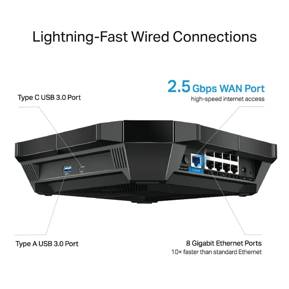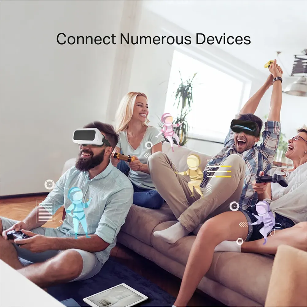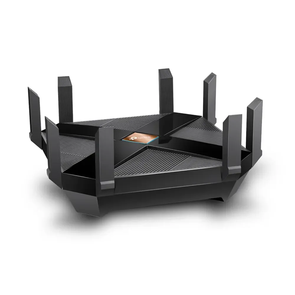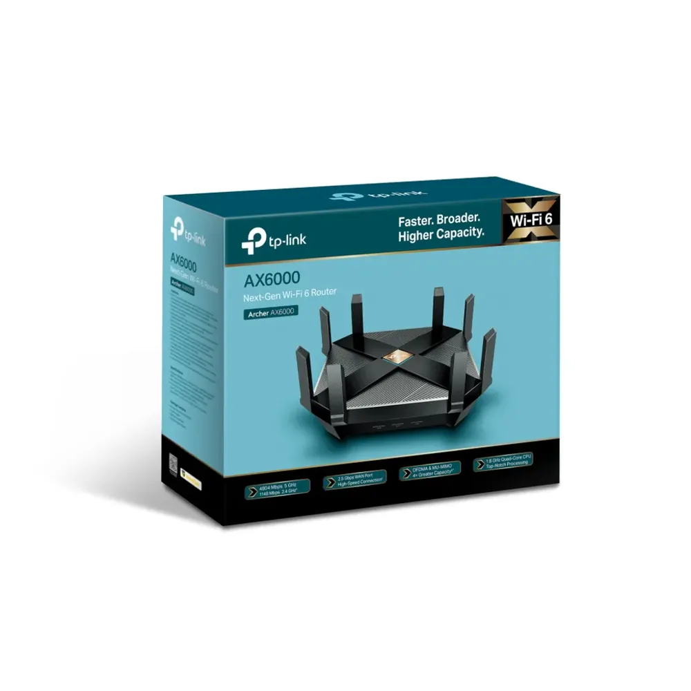 TP-Link Archer AX6000 Wi-Fi 6 Router Tp-Link AX6000 Next Gen WIFI Router, 1,8Ghz Quad Core CPU, 4804Mbps at 5Ghz and 1148Mbps at 2.4Ghz Blazing Speed – AX6000 Dual-Band Wi-Fi speed boosted by 1024QAM deliver astonishing wireless speed up to 5952 Mbps: 4804 Mbps (5 GHz) and 1148 Mbps (2.4 GHz) Ultra Connectivity – 1 × 2.5 Gbps WAN port, 8 × Gigabit LAN ports, and 2 × USB 3.0 in Type A and Type C Highly Efficient – OFDMA increases average throughput by 4× in high-density scenarios, compared with an 802.11ac standard router. Downlink and uplink MU-MIMO are both supported. Powerful Processing – 1.8 GHz Quad-Core CPU and 2 coprocessors eradicate latency and deliver stable performance Intelligent Connection – Band Steering directs clients to the less congested band and Airtime Fairness optimizes the time usage Security System Built-In – TP-Link HomeCareTM provides the whole network with advanced antimalware service powered by Trend MicroTM, delivering Antivirus, Parental Controls and QoS Easy Setup – Link to your router via Bluetooth and set it up in minutes with the powerful Tether app Faster. Broader. Higher Capacity. 802.11ax Next-Gen Wi-Fi Router – Archer AX6000 What is 802.11ax Wi-Fi Fast. High Efficiency. Gaming, 4K/8K streaming, smart home devices, and AR/VR all compete for network resources, creating lag and crowding your network. To solve this problem, 802.11ax (also known as Wi-Fi 6), a next-gen high-efficiency Wi-Fi standard, was created. Now, you can simultaneously connect more devices and enjoy the optimum speed for each of them. Next-Gen Wi-Fi — 802.11ax The Archer AX6000 is TP-Link’s first router with next-generation 802.11ax Wi-Fi technology. Take your Wi-Fi to the next level while being backwards compatible with 802.11a/b/g/n/ac Wi-Fi standards. 4x Higher Performance The new Downlink and Uplink MU-MIMO and OFDMA achieve a performance boost 4× that of 802.11ac 4x Larger Capacity OFDMA greatly increases the number of connected devices by assigning channels to more devices 3x Faster Speed 1024 QAM and Long OFDM Symbol boost overall speeds up to an incredible 6000 Mbps Boosted Coverage BSS Color technology ensures smooth and stable connections by eliminating signal interference, while beamforming and Rangeboost deliver stronger and far-reaching network. Blazing Fast Speed New technologies that come with 802.11ax, such as 1024QAM and Long OFDM Symbol, allow the router to provide industry-leading speeds of up to 1148 Mbps on a 2.4GHz band and 4804 Mbps on a 5GHz band. With the maximum bandwidth increased to 160MHz, you enjoy blazing-fast speeds without any lag. Connect Numerous Devices Non-Stop Entertainment on All Your Devices With OFDMA and MU-MIMO technology, Archer AX6000 provides up to 4× higher capacity and throughput compared to standard AC routers in dense usage environments, greatly increasing the number of connected devices. Far-Reaching Wi-Fi Coverage 8 high-gain external antennas deliver a strong Wi-Fi signal throughout your home. BSS Color technology ensure smooth and stable connections by eliminate signal interference probably from your neighbors, while beamforming and Rangeboost deliver stronger and far-reaching network. Lightning-Fast Wired Connections The Archer AX6000 provides a 2.5Gbps WAN port to make fully use of the over 1Gbps internet access, boost the whole internet throughput. one Type C and one Type A USB 3.0 ports and eight Gigabit Ethernet ports also help to transfer data at blistering speeds for peak performance. Smarter. Faster. Safer. Top-Notch Processing Architecture An extremely powerful 1.8GHz 64-bit quad-core processor with two distinct co-processors and 8Gb of RAM powers through multiple complex tasks and demanding applications with ease. Its processing power allows the router to support multiple high-demand applications at the same time. HomeCare TP-Link HomeCare ensures every device on your network remains protected, with a threat database updated live by Trend Microâ„¢. Use the powerful parental controls to limit time spent online and block inappropriate content according to unique profiles created for each family member. Robust Parental Controls Block inappropriate content and restrict time spent online Built-In Antivirus Protect all connected devices in your home from online threats Quality of Service Prioritize devices and applications for faster performance when needed Setup Just Got a Lot Easier To set up the Archer AX6000 via Bluetooth, simply download the Tether app,follow the on-screen instructions, and get your network up and running in minutes. Connect Archer AX6000 to your cable modem and turn on both devices Download and launch the Tether app Link to your router via Bluetooth and follow the in-app instructions to complete the network setup Works with Alexa and IFTTT Add new devices to your network, prioritize devices and activities, share the guest Wi-Fi password and more with Amazon Alexa and your voice. With IFTTT, you can trigger actions when devices are connecting, disconnecting, or being added to your network. You can even choose to prioritize certain devices every time you use them. Specifications Hardware Features Memory : 1GB RAM and 128MB Flash Interface : 8 x 1G/100M/10M LAN Ports, 1 x 2.5G/2G/1G/100M WAN Port 1 x USB-A 3.0 Port + 1 USB-C 3.0 Port Button : Wi-Fi On/Off Button, Reset Button, WPS Button, Power On/Off Button, LED on/off Button External Power Supply : 12V/4A Dimensions ( W x D x H ) : 10.3×10.3×2.4in (261.2×261.2×60.2mm) Antenna : 8 High-Performance External Antennas Wireless Features Wireless Standards : IEEE 802.11ax/ac/n/a 5GHz + IEEE 802.11ax/n/b/g 2.4GHz Frequency : 2.4GHz and 5GHz Signal Rate : 5GHz: 4804Mbps(802.11ax), 2.4GHz: 1148Mbps(802.11ax) compatible with 802.11a/b/g/n/ac Wi-Fi standards Reception Sensitivity : 5GHz: 11a 6Mbps?-97dBm, 11a 54Mbps:-79dBm 11ac VHT20 MCS0:-96dBm, 11ac VHT20 MCS11:-66dBm 11ac VHT40 MCS0:-94dBm, 11ac VHT40 MCS11:-63dBm 11ac VHT80 MCS0:-