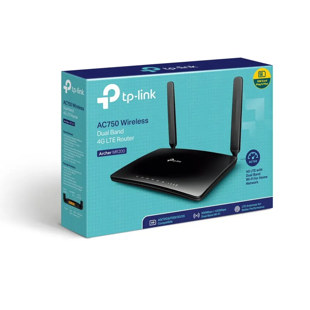 TP-Link Archer MR200 AC750 Wireless Dual Band 4G LTE Router TP-LINK Wireless N Sim Slot 3G/4G/LTE Router Shares your 4G LTE network with multiple Wi-Fi devices and enjoy download speeds of up to 150 Mbps Features: – Powerful, integrated antennas provide stable wireless connections and better coverage – Requires no configuration, just insert a SIM card and turn it on to enjoy a fast wireless connection – Creates simultaneous dual band Wi-Fi networks, with maximum speeds of up to 300 Mbps on the 2.4GHz band and 433 Mbps on the 5GHz band – Offers options and flexibility with the LAN/WAN port, allowing you to choose your connection type What’s in the box 1 x Wireless Slim Slot 3G/4G/LTE Router Archer MR200 1 x Power Adapter 1 x RJ45 Ethernet Cable 1 x Quick Installation Guide
