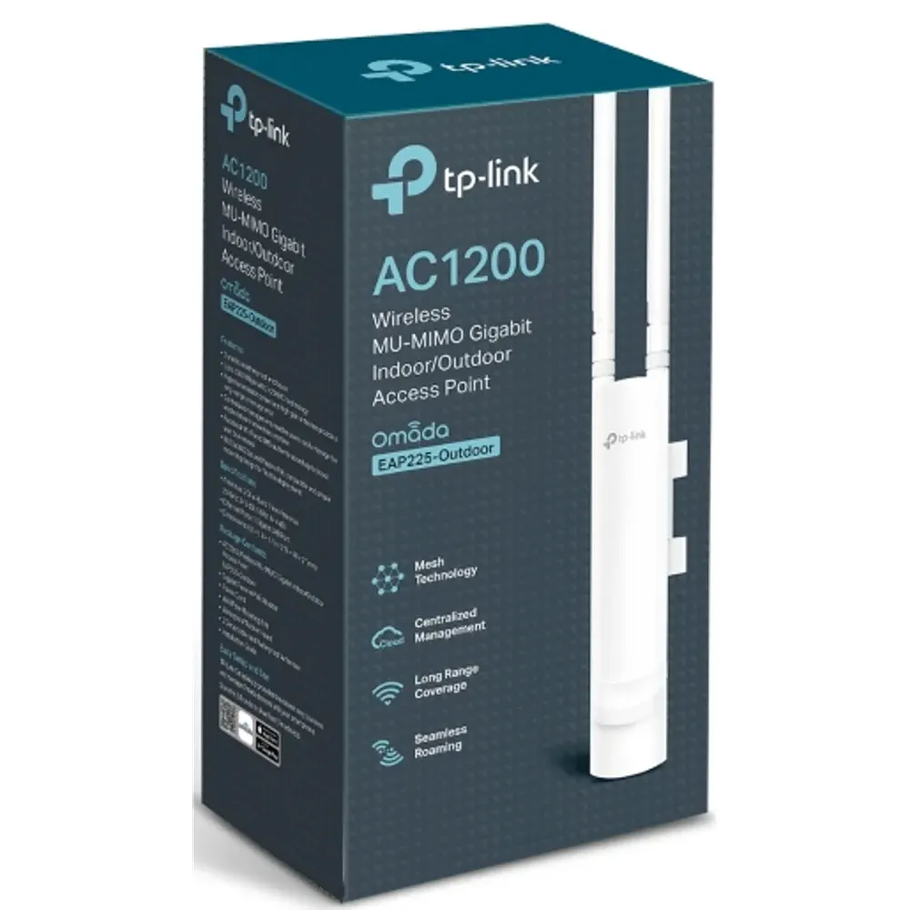 TP-Link EAP225-Outdoor AC1200 Dual Band Access Point EAP225-Outdoor AC1200 Wireless MU-MIMO Gigabit Indoor/Outdoor Access Point Durable, weatherproof enclosure for outdoor Wi-Fi applications Up to 1200Mbps with 2×2 MIMO technology High transmission power and high gain antennas provide a long-range coverage area Free Omada Controller software enables administrators easily manage hundreds of EAPs Captive portal provides a convenient method for guest authentication Facebook Wi-Fi and SMS anthentication help to boost your business 802.3af/Passive PoE (PoE Adapter Included) compatible and simple mounting design allow for flexible deployment and convenient installation Gigabit Wi-Fi Speeds with MU-MIMO Technology EAP225-Outdoor supports simultaneous dual band speed of up to 1200Mbps. Outfitted with the latest 802.11ac Wave 2 MU-MIMO technology, EAP225-Outdoor can communicate with multiple clients at the same time which making it ideal for high density environment. Excellent Hardware Designs With special design of its antenna, appearance, power options and installation methods, EAP225-Outdoor can perfectly fit for different scenarios both indoors and outdoors. Detachable Antennas EAP225-Outdoor is designed with 2 Omni-directional detachable antennas, which means other antennas can also be attached for your specific demands. Wi-Fi That Goes the Distance With high transmission power and high gain omnidirectional antennas, EAP225-Outdoor provides stable wireless coverage at a range up to 200m+ at 2.4GHz and 300m+ at 5GHz in outdoor settings. Specially Designed Weatherproof Enclosure for Outdoor Environment Rated as IP65 during Ingress Protection testing, a resilient weatherproof enclosure protects the access points against harsh outdoor condition. 4KV Lightning Protection and 15KV ESD Protection No Ingress of Dust Water Proof Enclosure Efficient Centralized Network Management With Omada Controller software, small and medium-sized businesses can take command of hundreds of indoor and outdoor access points all from a single location. It’s network management as it should be – efficient and intuitive. Specifications Hardware Features Interface : Gigabit Ethernet (RJ-45)Port*1(Support 802.3af PoE and Passive PoE) Button : Reset Power Supply : 802.3af/A PoE , 24V Passive PoE (+4,5pins; -7,8pins. PoE Adapter Included) Power Consumption: 10.5W Dimensions ( W x D x H ) : 8.5 × 1.8 × 1.1in. (215 × 46 × 27 mm) Antenna : 2.4GHz: 2 x 3dBi, 5GHz: 2 x 4dBi Weatherproof Enclosure : IP65 Mounting : Pole/Wall Mounting (Kits included) Hardware Watch Dog : Yes Wireless Features Wireless Standards : IEEE 802.11a/b/g/n/ac Frequency : 2.4GHz, 5GHz Signal Rate : 802.11ac: 5G:6.5 Mbps to 867Mbps(MCS0-MCS9,NSS = 1 to 2 VHT20/40/80) 2.4G:78Mbps to 300Mbps (MCS8-MCS9 VHT20/40, NSS=1 to 3) 802.11n: 6.5 Mbps to 300 Mbps (MCS0-MCS15, VHT 20/40) 802.11g: 6, 9, 12, 18, 24, 36, 48, 54 Mbps 802.11b: 1, 5.5, 11Mbps 802.11a: 6, 9, 12, 18, 24, 36, 48, 54 Mbps Wireless Functions : Multiple SSIDs?Up to 16 SSIDs, 8 for each band? Enable/Disable Wireless Radio Automatic Channel Assignment Transmit Power Control ?Adjust Transmit Power on dBm? QoS(WMM) MU-MIMO Airtime Fairness Beamforming Band Steering Load Balance Rate Limit Reboot Schedule Wireless Schedule Wireless Statistics based on SSID/AP/Client Wireless Security : Captive Portal Authentication Access Control Wireless Mac Address Filtering Wireless Isolation Between Clients SSID to VLAN Mapping Rogue AP Detection 802.1X Support Transmission Power : CE: FCC: Management Omada App : Yes Omada Cloud Controller : Yes Omada Controller Software : Yes Cloud Access : Yes Email Alerts : Yes Management MAC Access Control : Yes System Logging Local/Remote Syslog : Yes SSH : Yes Web-based Management : Yes L3 Management : Yes Multi-site Management : Yes Management VLAN : Yes Others Certification : CE?FCC?RoHS Environment : Operating Temperature: -30?~70? (-22?~158?) Storage Temperature: -40?~70? (-40?~158?) Operating Humidity: 10%~90% non-condensing Storage Humidity: 5%~90% non-condensing What’s in the box 1 x AC1200 Wireless MU-MIMO Gigabit Indoor/Outdoor Access Point 1 x EAP225-Outdoor 1 x Power Adapter 1 x Mounting Kits 1 x Installation Guide