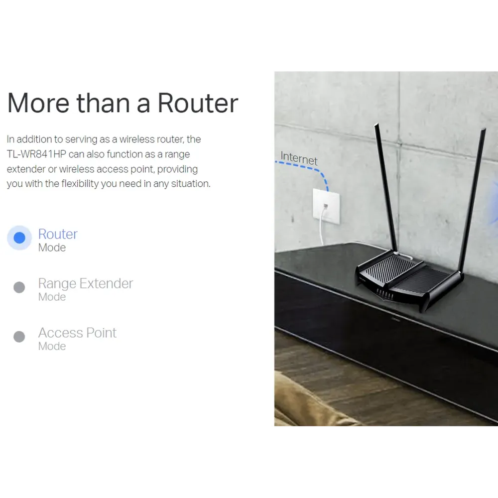 TP-Link TL-WR841HP N300 High Power Wi-Fi Router TP-Link?s new 300Mbps High Power Wireless N Router, the WR841HP is a powerful wireless solution well suited for the home or office. With 300Mbps wireless speeds, the WR841HP is ideal for streaming HD video, making VoIP calls and online gaming. Featuring a high power signal amplifier and two 9dBi antennas providing up to 1000mW transmission power The device greatly boosts Wi-Fi performance. – Superior Range ? High power amplifier and high-gain antennas provide enhanced wireless range up to 10,000 sq ft,1 – Wall-Penetrating Wi-Fi ? Enhanced Wi-Fi signal cuts through walls and obstacles, eliminating dead zones – 3 Modes Functionality ? Offers three wireless modes, including Router, Range Extender, and Access Point – 300Mbps wireless speed ? Ideal for video streaming, online gaming and VoIP Specifications: – Realtek – Indoor – 600mw – 2T2R – 2.4GHz 802.11n/g/b – Built-In 4-Port Switch – 2x 5dBi Det Antennas What’s in the box TP-LINK TL-WR841HP 300Mbps High Power Wireless N Router